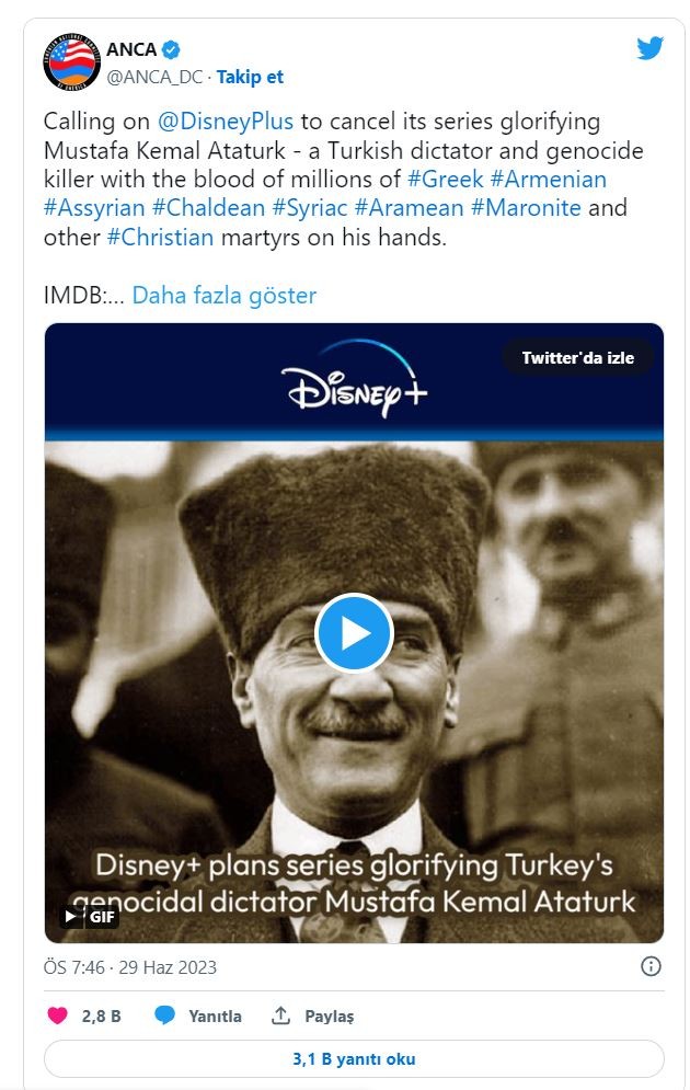 Konuyla ilgili Disney Plus’ı tehdit eden topluluk ise Amerika Ermeni Ulusal Komitesi (The Armenian National Committee of America-ANCA). Bu örgüt tarafından yapılan paylaşımda, Türkiye Cumhuriyeti’nin kurucusu Mustafa Kemal Atatürk için Hristiyan başlığı altında 7 farklı etnik gruptan milyonlarca insanı öldürerek soykırım yaptığı söylendi.