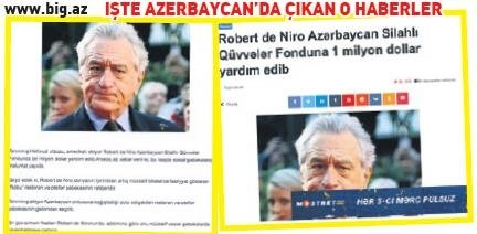Azerbaycan'da pek çok haber sitesi, ünlü aktör Robert De Niro'nun Azerbaycan Silahlı Kuvvetler Yardım Fonu'na 1 milyon dolar bağış yaptığını iddia eden haberlere yer verdi.
