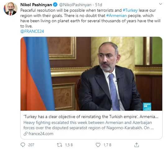 France24 televizyonuna konuşan Ermenistan Başbakanı Nikol Paşinyan, Türkiye ile ilgili akılalmaz açıklamalarda bulundu. Savaşta yenilme korkusuyla saçmalamaya başlayan Paşinyan, Türkiye'nin Suriye ve Irak'ta terör örgütlerine yönelik harekatlarını, Doğu Akdeniz'de ise Yunanistan'la yaşadığı gerilimi örnek vererek "Ermenistan, Türkiye'nin kuzeye ve doğuya doğru genişlemesinin önündeki son engeldir" dedi. Avrupa ülkelerine Türkiye'ye karşı akıl vermeye çalışan Paşinyan "Türkiye'nin 'Türk İmparatorluğu'nu kurmak gibi bir hedefi var. Bu politikada burada başarılı olursa şaşırmayın. Sadece Yunan Adaları değil, Avrupa kıtasında da yayılmaya çalışırlarsa şaşırmayın. Eğer Türkiye bunları başarırsa onları Viyana'da bekleyin" ifadelerini kullandı.