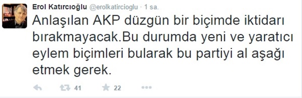 Today's Zaman yazarı Sevgi Akarçeşme'nin darbe imasından bulunarak attığı "İslamcılar seçimle gelir, ama seçimle gitmez argümanını ispatladığın için teşekkürler AKP" twitinden sonra Özgür Gündem gazetesi yazarı Prof. Dr. Erol Katırcıoğlu da benzer bir twite imza attı.