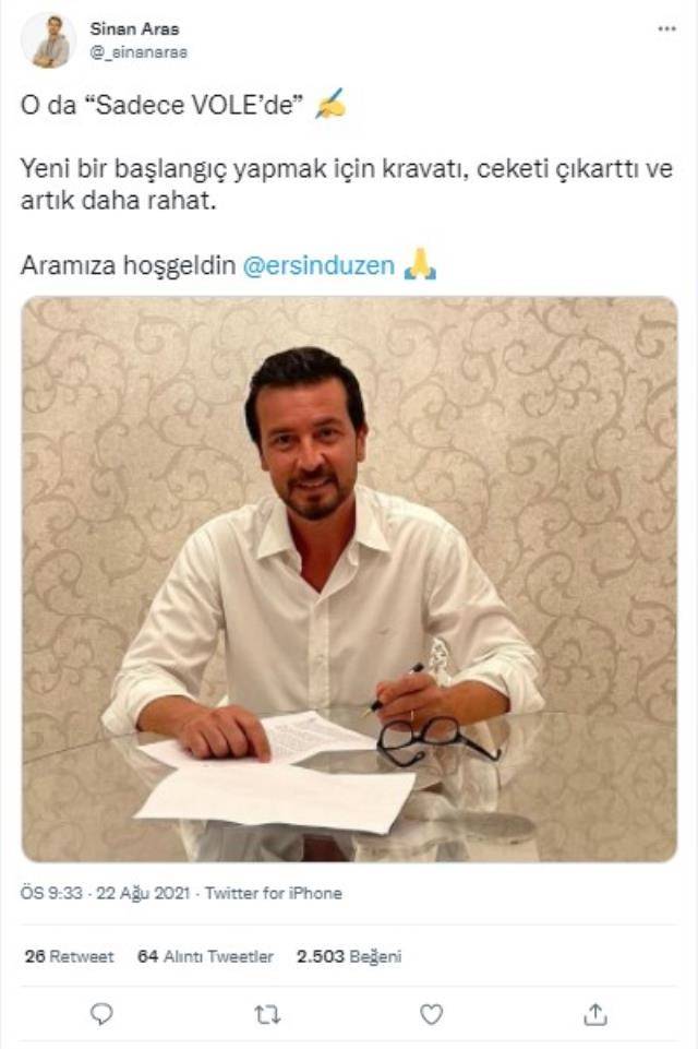 VOLE'nin kurucu ortağı Sinan Aras, sosyal medyadan Ersin Düzen'in kadroya katıldığını duyurdu. Aras, "Yeni bir başlangıç yapmak için kravatı, ceketi çıkarttı ve artık daha rahat. Aramıza hoşgeldin @ersinduzen" paylaşımıyla haberi duyurdu.