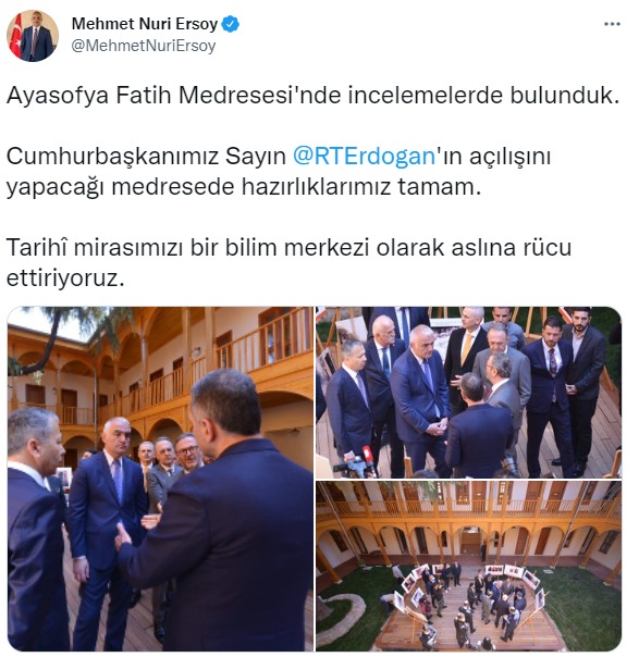 Kültür ve Turizm Bakanı Mehmet Nuri Ersoy Ayasofya Fatih Medresesi'nde incelemelerde bulundu. Denetlemeye ilişkin sosyal medya hesabı üzerinden paylaşımda bulunan Ersoy, “Ayasofya Fatih Medresesi'nde incelemelerde bulunduk. Cumhurbaşkanımız Sayın @RTErdogan'ın açılışını yapacağı medresede hazırlıklarımız tamam. Tarihî mirasımızı bir bilim merkezi olarak aslına rücu ettiriyoruz” dedi.