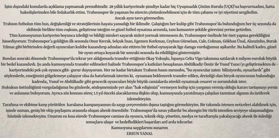 TRABZONSPOR'UN ERSUN YANAL AÇIKLAMASI