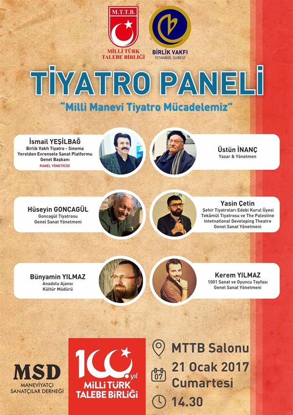 Milli Türk Talebe Birliği, Birlik Vakfı Genel Merkezi, İstanbul Şubesi, Birlik Vakfı Tiyatro Sinema Kulübü ve Maneviyatçı Sanatçılar Derneği olarak ülkemizde Yerli-Milli Manevi tiyatro mücadelesini önemseyenleri 21 Ocak Cumartesi günü saat 14:30'da Cağaloğlu'ndaki MTTB salonunda yapacağımız Milli-Manevi Tiyatro Mücadelemiz isimli Panelimize davet ediyor ve bekliyoruz.