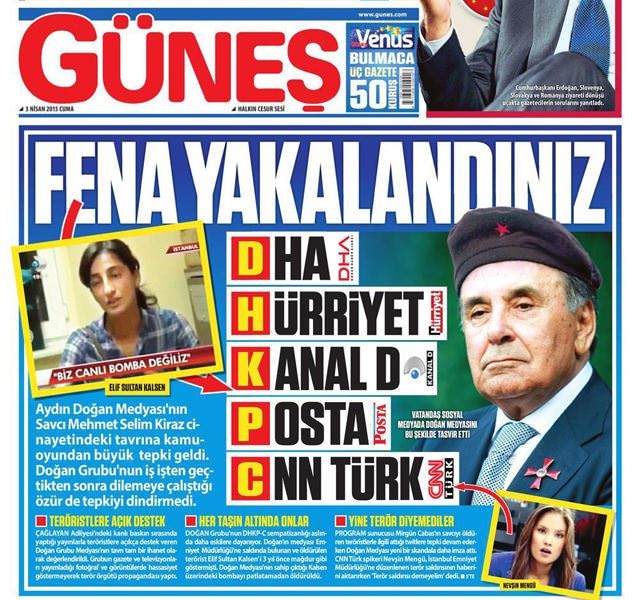 Hürriyet'in şehit savcının katillerinin propaganda fotoğraflarını basması ve Doğan Grubu'na bağlı bazı gazetecilerin katilleri aklama çabalarına Güneş gazetesi sert bir manşetle tepki göstermişti.