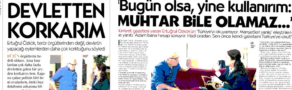 Aydın Doğan’ın paçavrası Hürrriyet’te köşe karalayan Ertuğrul Özkök, paralel yapının güdümündeki Cumhuriyet Gazetesi’ne verdiği röportajda skandal ifadeler kullanarak “terörden korkmam devletten korkarım” diyerek terörist sevgisini açığa çıkardı. Özkök Hürriyet’in Erdoğan için attığı ‘Muhtar bile olamaz’ manşetini de savunmaya devam etti.