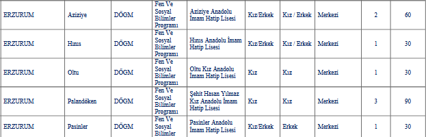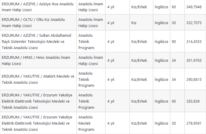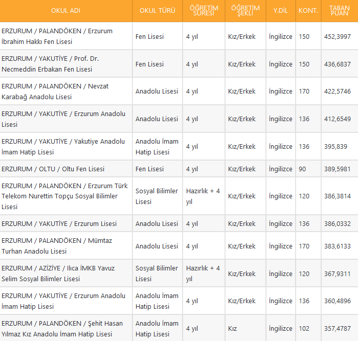 Erzurum liseleri taban puanı 2021, Erzurum liseleri başarı sıralaması ve liseleri kontenjanları nelerdir?