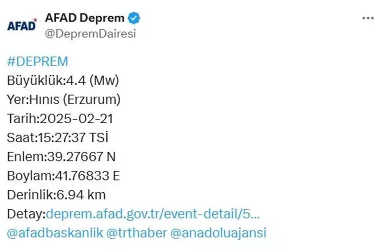 Kandilli Rasathanesi, Erzurum'un Hınıs ilçesinde 4.3 büyüklüğünde bir deprem meydana geldiğini duyurdu. Saat 15:27'de gerçekleşen depremin derinliği 7.5 km olarak tespit edildi.