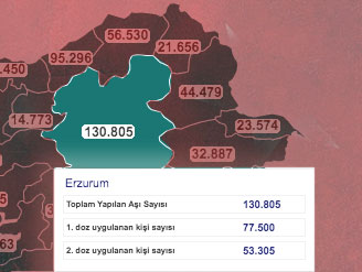 Sağlık Bakanlığı aşılama verilerine göre, Erzurum'da 6 Nisan saat 14:24 itibariyle toplam aşı olanların sayısı 130,805 olarak görünüyor.