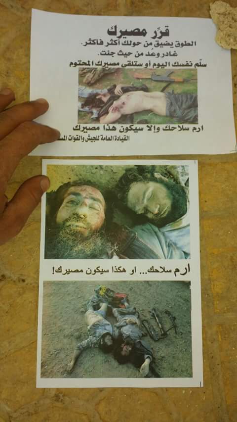 Rejime bağlı uçakları Halep başta olmak üzere birçok bölgeye Esed güçlerinin katledip başlarını kestiği direnişçi güçlerin fotoğraflarını atarak, ''eğer teslim olmazsanız sonunuz böyle olacak'' yazılı braşürler dağıttı.