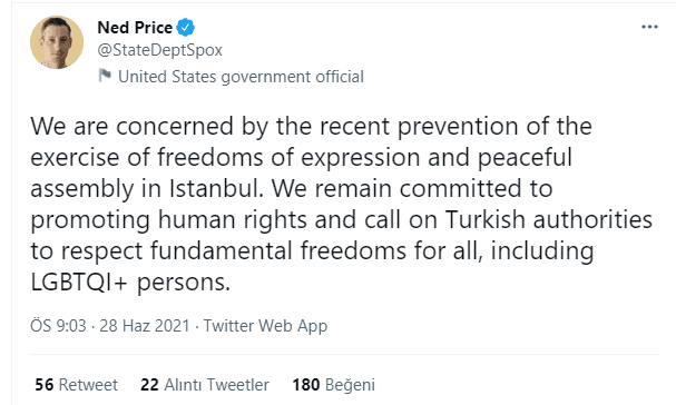 Devreye giren eşcinsel sapıkların ağababaları, haddi aşan ifadelerle AK Parti iktidarına çağrıda bulundu. Twitter hesabından bir mesaj paylaşan ABD Dışişleri Bakanlığı Sözcüsü Ned Price, "Türk yetkilileri, LGBTQİ+ bireyler de dahil olmak üzere herkesin temel özgürlüklerine saygı duymaya çağırıyoruz. Son zamanlarda İstanbul'da ifade ve barışçıl toplanma özgürlüklerinin engellenmesinden endişe duyuyoruz." dedi.