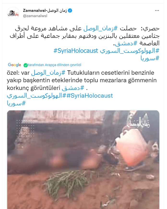 Zaman el Wasl'ın haberine göre, Rusya ve İran destekli Esed rejimi güçlerinin, tutukluların cesetlerini benzinle yakıp imha ettiği ve ardından toplu mezarlara gömdüğü görüntüler yayınlandı.