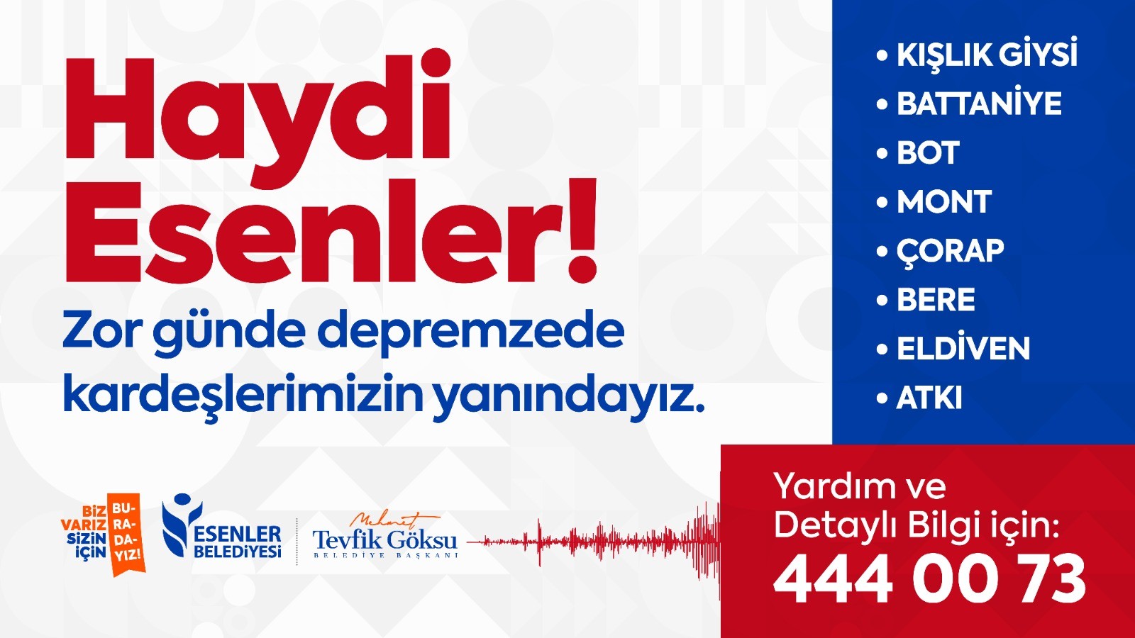 Diğer taraftan Esenler Belediyesi deprem bölgesine ulaştırılmak üzere ilçede yardım kampanyası başlatıldı. Acil ihtiyaç ile birlikte gıda maddelerini kapsayan yardım kampanyasında toplanan malzemeler periyodik olarak TIR’larla yardım bölgesine gönderilecek.