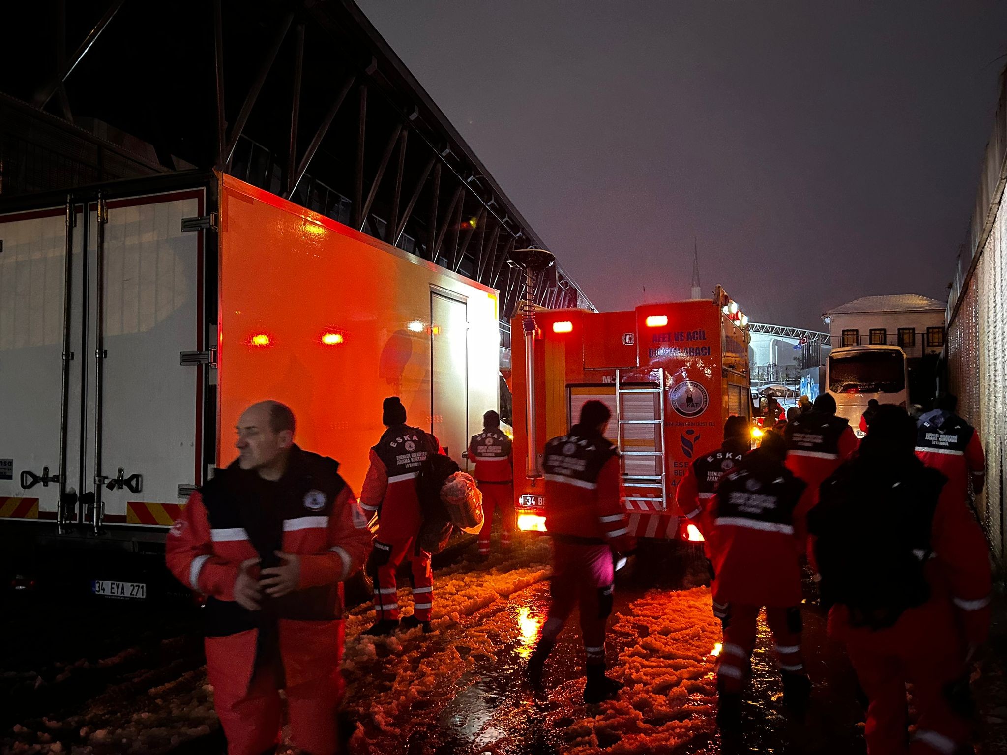 31 kişilik ESKAT ekibi; tam donanımlı arama kurtarma aracı, seyyar mutfağı, ısıtıcılar ve battaniyelerle birlikte deprem bölgesine ulaştırılmak üzere TIR’larla yola çıktı. Mont, kaban, bot, bere, atkı, eldiven, çorap, soba ve bebek bezi gibi diğer ihtiyaç maddeleri ile birlikte, pirinç, makarna, margarin, su, mama gibi gıda maddelerinden oluşan yardım TIR’ları da gün içerisinde yola çıkmak üzere hazırlıklar yapılıyor.