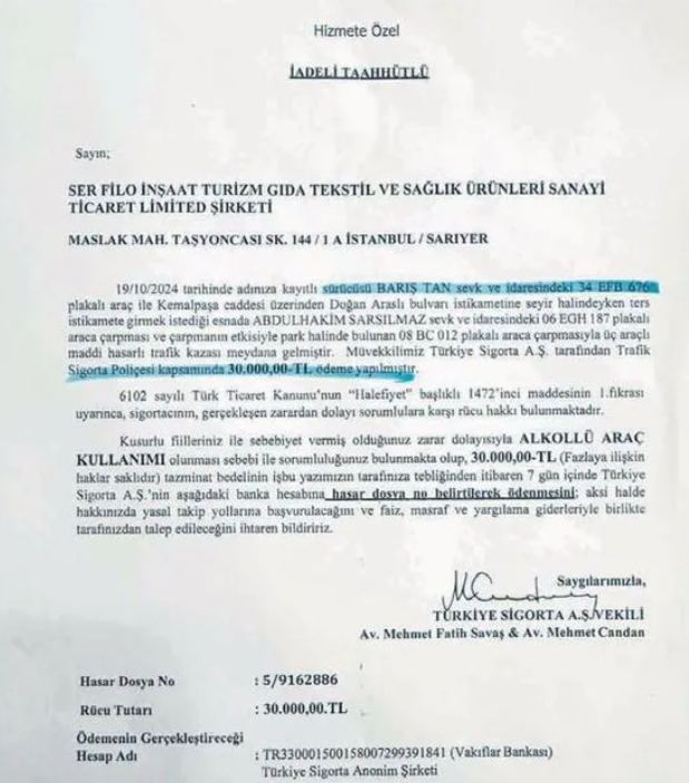 Esenyurt Belediyesi Başkanvekili olarak görevlendirilen İstanbul Vali Yardımcısı Can Aksoy, belediye aracının tahsisini iptal ettirmekle kalmadı, hasar bedelini belediyeye ödettiren baba ile oğlunun 30 bin TL'yi belediyeye ödemesi için ihtar göndertti.
