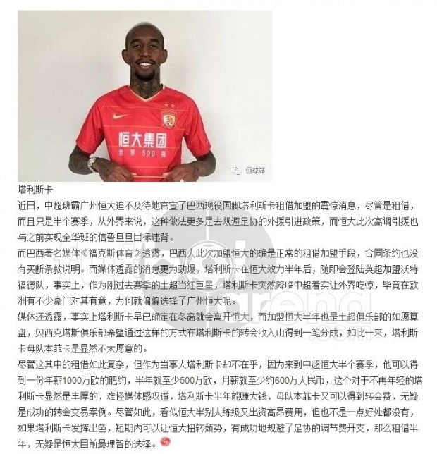 Talisca, transfer tercihini ise, “Çin'e gidiyorum çünkü ülke futbolunun büyümesinin bir parçası olmak, burada tarihe geçmek ve Çin'in futbol piyasasında saygı duymasını sağlamak istiyorum” diye özetlemişti.
