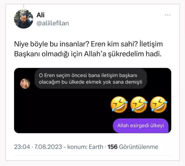 CHP’nin eski sosyal medya sorumlusu Ali Sinan Acıoğlu, Twitter'dan yaptığı paylaşımda “Eren kim sahi? İletişim Başkanı olmadığı için Allah’a şükredelim hadi.” ifadelerini kullandı.