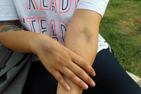 “Ben 15 yaşında evlendim, üvey dayımın oğlu, annem beni zorla evlendirdi. Ben eşimi nişan günü gördüm. Koruma kararı verdiler, uzaklaştırma kararı verdiler, adam ihlal ettiği halde hiçbir şey yapılmadı. Bu olay yaşındı geçtiğimiz gün, bir gün nezarette kaldı ertesi gün adli kontrol şartı ile serbest kaldı. Ben artık adaletten yardım istemiyorum, ben kadınlardan yardım istiyorum. O elini kolunu sallaya sallaya geziyor, benim can güvenliğim yok, verdikleri koruma, uzaklaştırma kararları hiçbir şeye yaramıyor. Sabaha kadar ben dünden beri eve gidemedim, bu yaralı halimle dışarıda dolaşıyorum, korkuyorum eve her gittiğimde çıktığımda binanın önünde bekliyor. Gözaltına alınmasını, tutuklanmasını istiyorum, adalet yerini bulsun, bir yıl önce boşandık ama hala evli olduğumuzu iddia ediyor.”