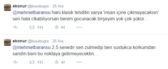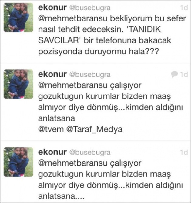 Konur, "2.5 senedir sustuğum herşeyi paylaşacağım… Çalışıyor gözüktüğün kurumlar bizden maaş almıyor diye dönmüş… Kimden aldığını anlatsana. Bekliyorum bu sefer nasıl tehdit edeceksin. Bir telefonuna bakacak pozisyonda duruyor mu hala?" şeklinde tweet atarak takipçilerine birbirini ardına paylaşımda bulundu.