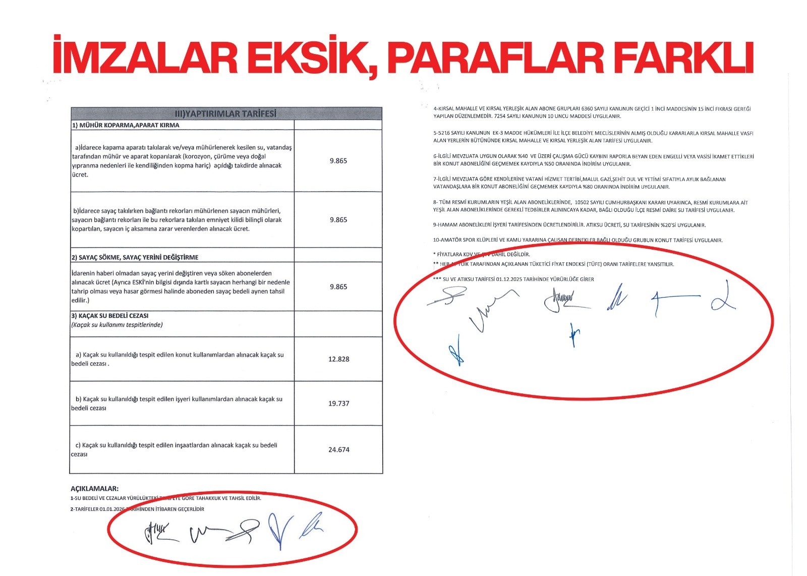 Söz konusu durum, yalnızca “Mühür Koparma/Aparat Kırma, Sayaç Sökme/Sayaç Yerini Değiştirme, Kaçak Su Bedeli Cezası” gibi yaptırım ve ilgili hizmet kalemlerine ilişkindir. Abonelerimizin rutin su tüketim bedelleri ile normal fatura süreçleri bu durumdan etkilenmemiştir.