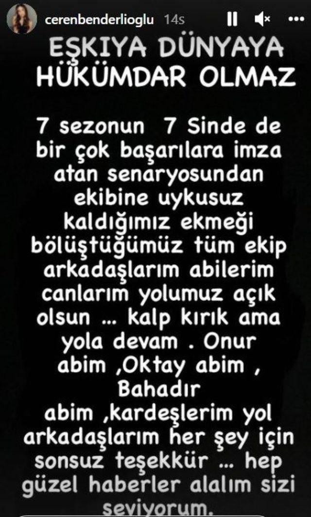 "EŞKIYA DÜNYAYA HÜKÜMDAR OLMAZ... 7 senenin 7'sinde de birçok başarılara imza atan, senaryosundan ekibine uykusuz kaldığımız, ekmeği bölüştüğümüz tüm ekip arkadaşlarım, abilerim, canlarım... Yolumuz açık olsun. Kalp kırık ama yola devam. Onur Abim, Oktay Abim, Bahadır Abim, kardeşlerim, yol arkadaşlarım. Her şey için sonsuz teşekkürler. Hep güzel haberler alalım, sizi seviyorum."