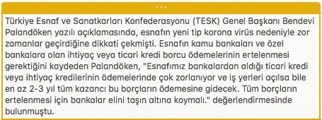 Korona salgınında en çok etkilenenler arasında esnaflar da yer almakta. Binlerce esnaf bankalardan aldıkları kredi borçlarını geri ödenelerinin ertelenmesini talep ediyordu. Esnafın kredilerinin ertelenmesi konusunda esnaf temsilcileri esnafın zor durumda olduğunu söyleyerek, "Tüm borçların ertelenmesi için bankalar elini taşın altına koymalı." ifadesini kullanıyordu. Hükümet, esnafın mağduriyetine sessiz kalınmadığını gösterdi ve binlerce esnafın kredi borçlarının ertelendiğini açıkladı. Peki esnafın kredi borcu ne zamana kadar ertelendi?