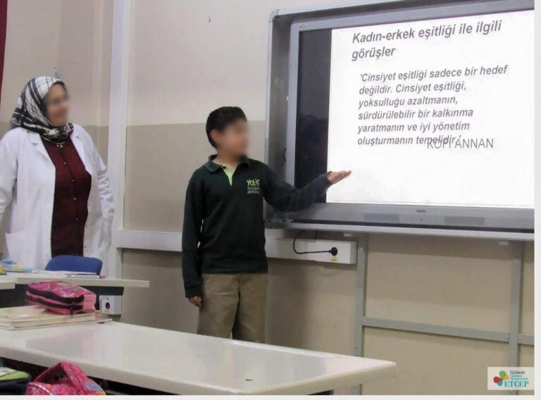 Proje kapsamında çocuk yaştaki öğrencilere verilen bir diğer eğitimde ise Mustafa Kemal Atatürk ve Kofi Annan’ın sözleriyle cinsiyetin, eşitliğe aykırı ve kalkınmaya engel olduğu ve de ortadan kaldırılması gerektiği aşılanıyor.