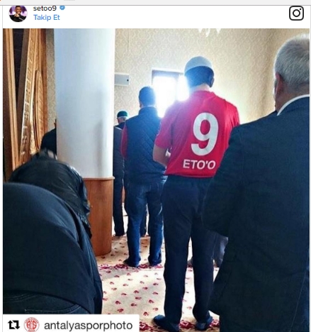 35 yaşındaki Kamerunlu oyuncu Antalyasporlu bir taraftarın üzerine Eto'o formasıyla namaz kılarken çekilmiş fotoğrafını paylaştı.