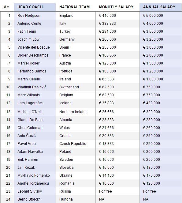 Listede İngiltere'yi çalıştıran Roy Hodgson, 5 milyon euro ilk sırada yer alırken, Antonio Conte 4 milyon 600 bin euro ile ikinci sırada yer aldı. 2014 Dünya Kupası'nda Almanya'yı şampiyon yapan Löw ise 3 milyon 200 bin euro maaş alıyor.