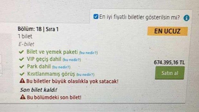 Sezon başında bilet alan bir taraftar saha içi koltuğunu tam 674 bin 395 Lira 16 kuruştan satışa çıkarttı.