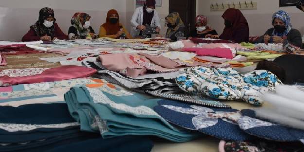 Şahinbey Belediyesi tarafından yapılan sosyal tesislerdeki kurslara gelen ev hanımları, evde atıl durumdaki kumaşlardan çeyizlik eşya yaparak aile ekonomilerine katkıda bulunuyor.