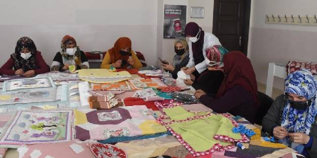 Şahinbey Belediyesi’ne ait Şehit Cevdet Özdemir Sosyal Tesisi’ndeki kurslara gelen kadınlar, evde kullanılmayan eski battaniye, CD, yırtık kumaşlar ve benzeri eşyaları değerlendirerek pike takımı, seccade, yastık kılıfı, eldiven gibi çeyizlik eşya yaparak hem aile ekonomilerine katkı sağlıyor hem de meslek öğreniyorlar.