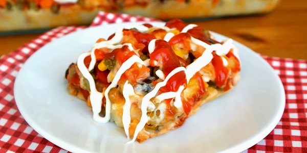 Ardından Sosis, mısır, haşlamış havuç, kornişon turşu ve zeytinleri patateslerin üzerine yayın.