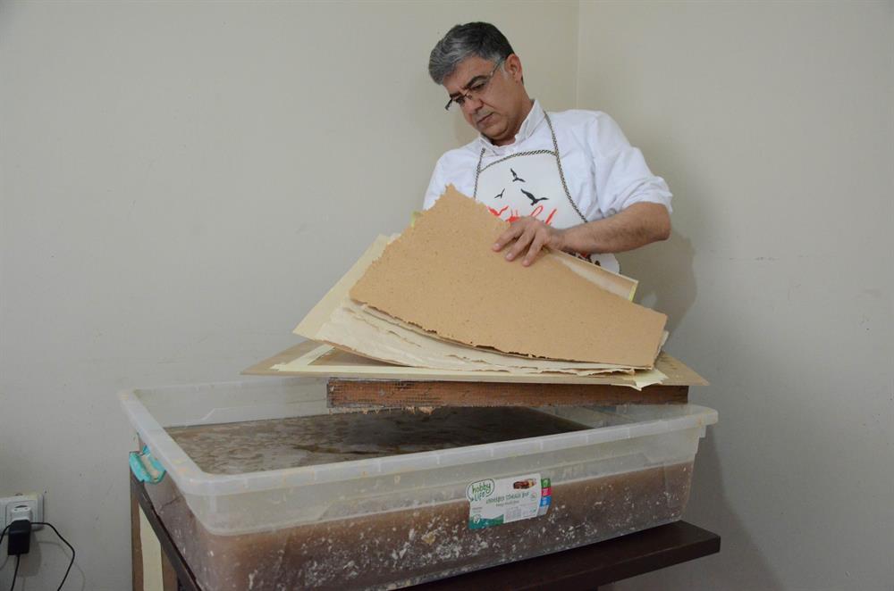 “Biz de, hattatların işlerini en iyi şekilde yapması için bu kağıtları yapmaya çalışıyoruz. Kağıt yapabilmek için ilk aşama pamuk. Bu kağıtlar, güzel sanatlar için ve Kuran'ı Kerim yazımı için kullanılıyor. Pamuk, özel bir kağıt, yumurta akı, nişasta ve suyu mikserle karıştırıyorum ve ortaya hat sanatında kullanılan kağıt çıkıyor. Elde ettiğim hamuru kalıbın içine döküyorum. Üstüne başka bir kalıp daha koyuyorum. Fırınladıktan sonra pencereye asıyorum. Bu özel kağıtlar çok uzun ömürlü. Çok eski Kuran'ı Kerimleri gördüm. En az 600 yıllık Kuran'ı Kerim'ler var. Bu kağıtlar o kadar güzel işlenmiş ki, böcekler bile içine girip zarar veremiyor. İstanbul başta olmak üzere hat sanatıyla uğraşan birçok ildeki kişilere yapıp aharladığım kağıtları gönderiyorum. Vel Kalem Geleneksel Sanatlar ve Kültür Derneği'ndeki arkadaşlar da bu kağıtlara büyük ilgi gösteriyor"