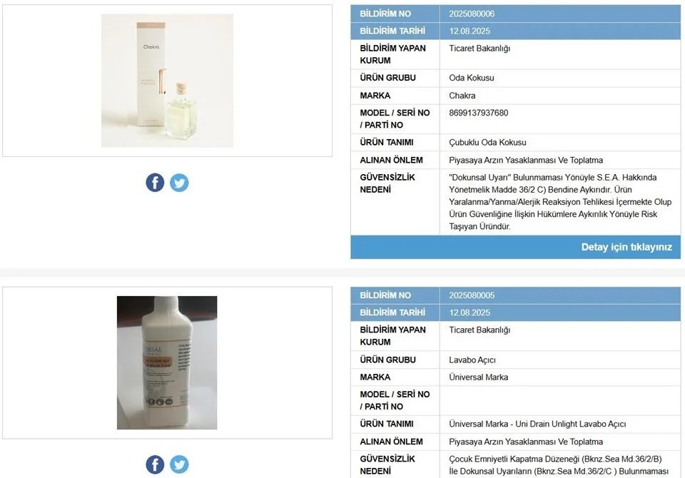 Ticaret Bakanlığı, denetimlerini sürdürürken iki popüler ürüne yasak getirdi. Chakra markasına ait çubuklu oda kokusu ile Üniversal marka Uni Drain Unlight lavabo açıcı, güvenlik standartlarını karşılamadığı gerekçesiyle piyasadan toplatılacak.