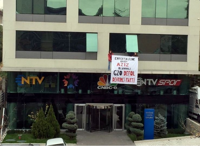 Nene Hatun Caddesi üzerindeki binanın ön yüzüne "Emperyalızime karşı aziz olunmalı G20 defol. Devrimci Parti" yazısı asan 3 kişi balkondan, diğer göstericiler ise binanın içinde sloganlar attı. Eylem, polis müdahalesiyle son buldu.