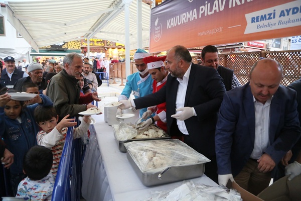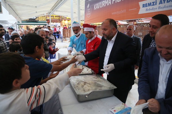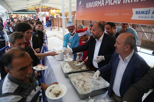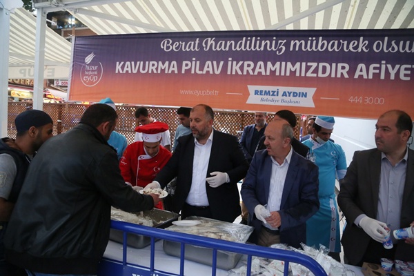Eyüp Belediyesi de ibadet için Eyüp'e gelen vatandaşlara kandil gecelerinde geleneksel hale gelen pilav ve kavurma ikramında bulundu.