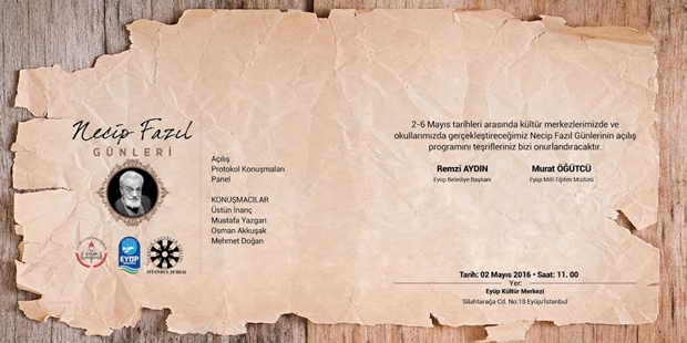 Eyüp Belediyesi, Eyüp İlçe Milli Eğitim Müdürlüğü ve Türkiye Yazarlar Birliği (TYB) İstanbul Şubesi'nin iş birliğiyle 2-6 Mayıs'ta Eyüp'te "Necip Fazıl Günleri" düzenlenecek.
