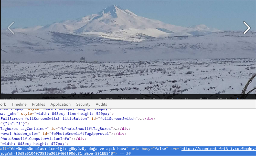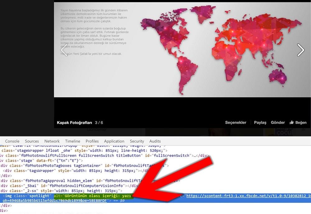 Bunu örnek olarak Yeni Şafak gazetesi resmi Facebook sayfasında yer alan kapak fotoğrafı ile denediğimizde kaynak kodları arasında “görüntülenen içerik: yazı” şeklinde bir etiket geliyor. Bunun dışında Erciyes dağının olduğu bir fotoğrafa da benzer işlemi yaptığınızda “Görüntünün olası içeriği: gökyüzü, doğa ve açık hava” etiketlerine rastlıyoruz. Kalabalık bir grubun olduğu fotoğraflarda ise “Görüntünün olası içeriği: 8 kişi, gülümseyen insanlar” etiketlerine yer veren Facebook, görüntü tanıma sistemi sayesinde kullanıcıların paylaşmadığı bilgilere de erişebiliyor.