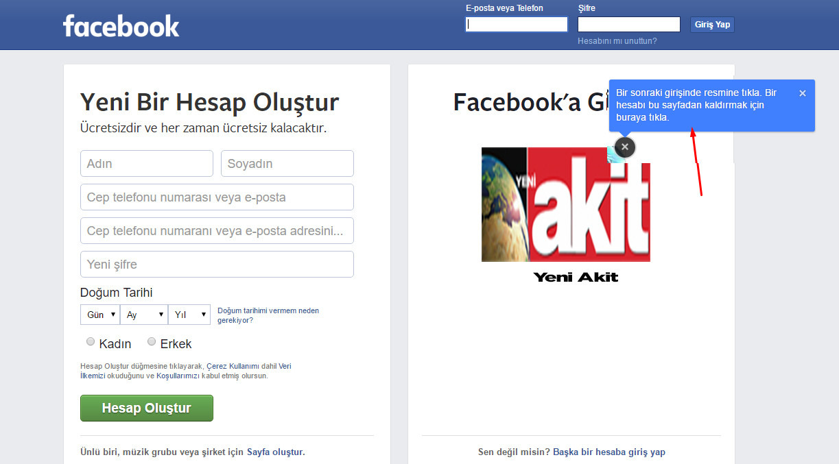 Yukarıdaki resimde görüldüğü gibi Facebook'tan çıkış yaptıktan sonra karşımıza gelen pencereden tekrar girmemiz için profil resmi ve ismini gösteriyor tabiki bununla kalmayıp isteğe bağlı bırakmış.
