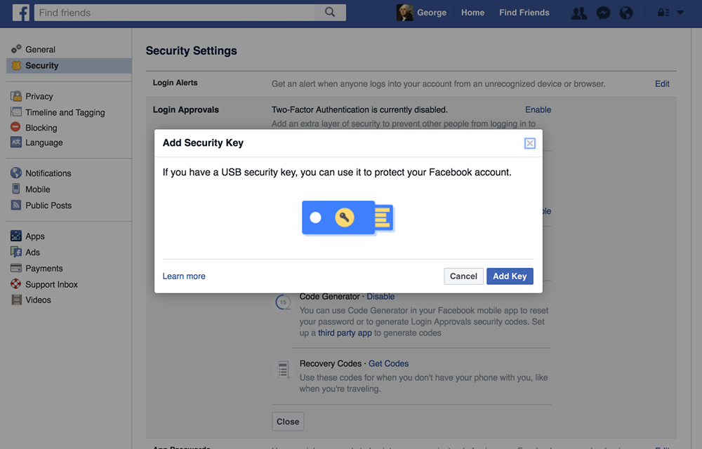 Firma şimdi de yukarıda saydığımız güvenlik önlemlerine Yubikey adı verilen yeni bir güvenlik önlemi daha elliyor. Kullanıcılar artık Facebook'a özel kullanacakları bir USB bellek ile güvenlik sorununun önüne geçebilecek. Platform için belirledikleri herhangi bir USB belleği sürücü haline getirerek unuttukları şifreyi yeniden almak için kullanabilecekler. Bir nevi anahtar olarak kullanabilecekler ve bunu yapabilmek için USB'yi bilgisayara takıp Facebook'a bağlanmanız yeterli oluyor.