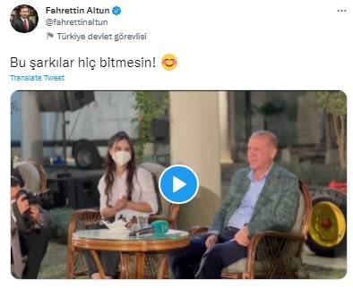 İletişim Başkanı Fahrettin Altun, gençlerle sohbet edip şarkılar söyleyen Başkan Erdoğan'ın görüntülerini sosyal medya hesabından paylaştı. Paylaşımında Erdoğan'ın gençlerle şarkı söylediği anlara yer veren Altun, "Bu şarkılar hiç bitmesin" notunu düştü.