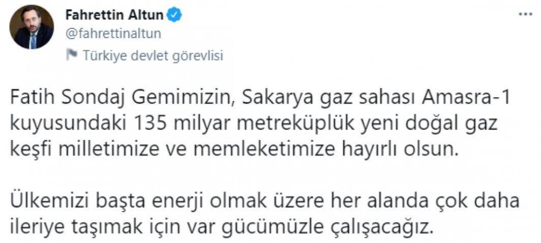 Cumhurbaşkanlığı İletişim Başkanı Fahrettin Altun, Amasra-1 kuyusunda 135 milyar metreküp doğal gaz müjdesinin ardından Twitter hesabından paylaşımda bulundu.