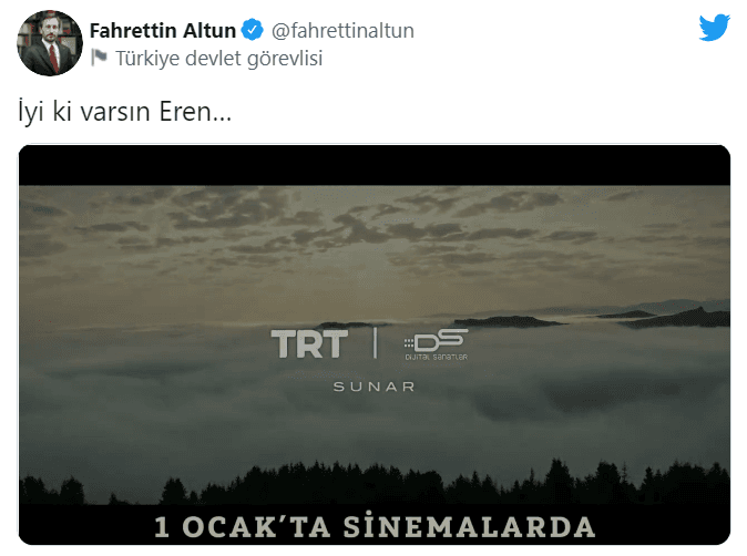 İletişim Başkanı Fahrettin Altun, 1 Ocak 2022'de gösterime girecek olan 'Kesişme; İyi ki Varsın Eren' filminin fragmanını "İyi ki varsın Eren…" notuyla paylaştı.