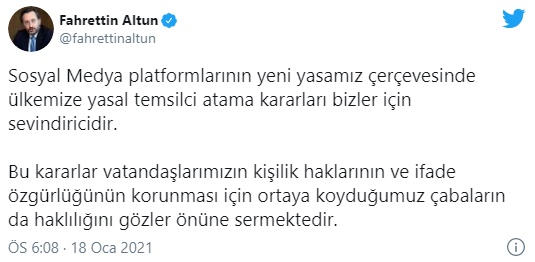 Altun, yaptığı açıklamada, "Sosyal medya platformlarının yeni yasamız çerçevesinde ülkemize yasal temsilci atama kararları bizler için sevindiricidir. Bu kararlar vatandaşlarımızın kişilik haklarının ve ifade özgürlüğünün korunması için ortaya koyduğumuz çabaların da haklılığını gözler önüne sermektedir" ifadelerini kullandı.