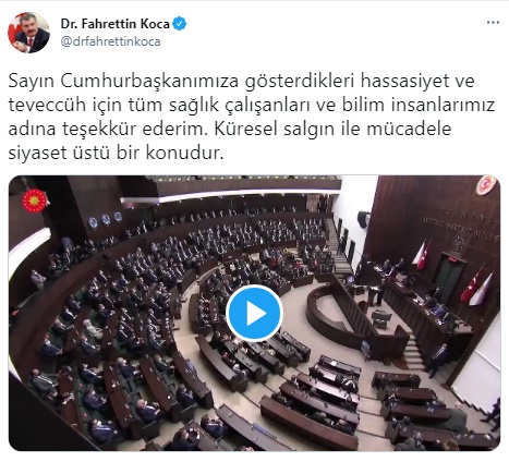 Bakan Koca, paylaşımında, "Cumhurbaşkanımıza gösterdikleri hassasiyet ve teveccüh için tüm sağlık çalışanları ve bilim insanlarımız adına teşekkür ederim. Küresel salgın ile mücadele siyaset üstü bir konudur" ifadelerini kullandı.
