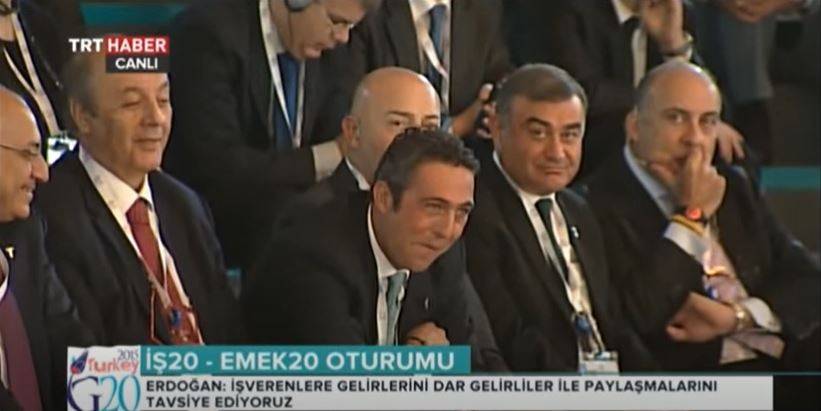 Cumhurbaşkanı Erdoğan’ın konuşması sırasında tüm ciddiyetsizliği ile diliyle dişinin arasında yemek artığı ayıklayan Fenerbahçe Spor Kulübü Başkanı Ali Koç, yüksek faize ağzını yamultup sırıtarak lakayt tavırlar sergilemişti.