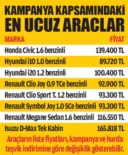 Kampanya çerçevesinde anlaşmalı otomotiv firmaları binek araçlarda Honda, Hyundai, Renault Mais, ticari araçlarda Isuzu ve Temsa gibi markalardan alışveriş imkânı sağlanıyor.