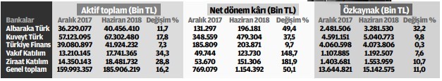 Katılım bankalarının kârı yılın ilk yarısında 1 milyar lirayı aştı. Albaraka Türk, Kuveyt Türk, Türkiye Finans Katılım Bankası, Vakıf Katılım ve Ziraat Katılım’ın konsolide olmayan toplam aktif büyüklüğü 185 milyar 906 milyon liraya ulaştı.
