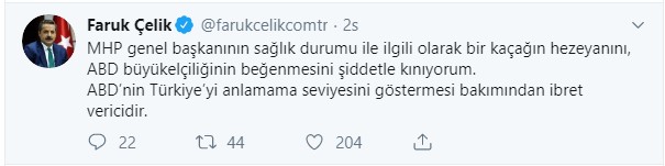 Yaşanan gelişmeyi şiddetle kınadığını belirten Faruk Çelik, "MHP genel başkanının sağlık durumu ile ilgili olarak bir kaçağın hezeyanını, ABD büyükelçiliğinin beğenmesini şiddetle kınıyorum. ABD’nin Türkiye’yi anlamama seviyesini göstermesi bakımından ibret vericidir" dedi.